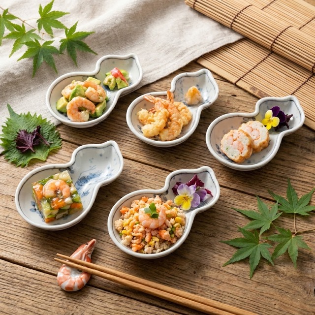 瓢箪型小鉢揃 染付海老 万平窯