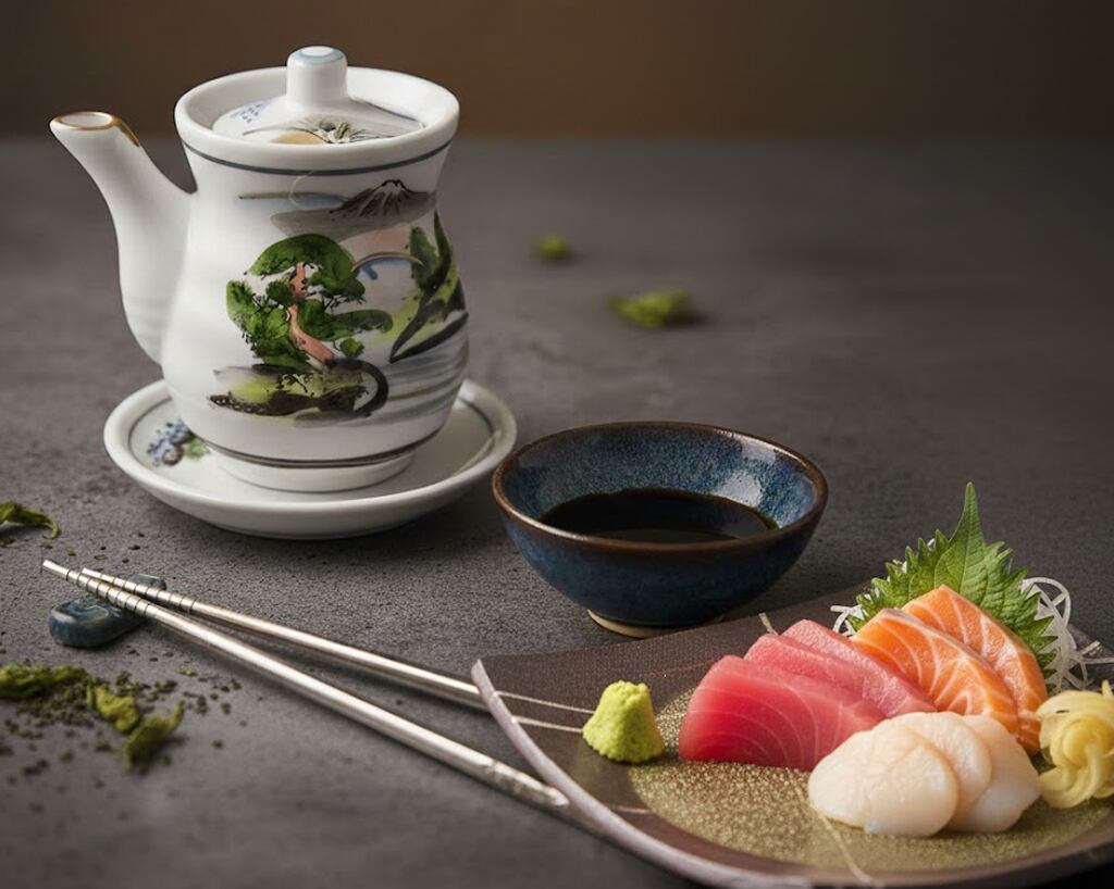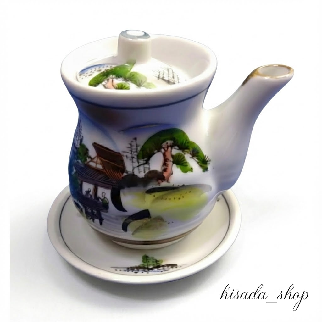 - A soy sauce pourer beautifully decorated with a traditional Japanese landscape pattern.