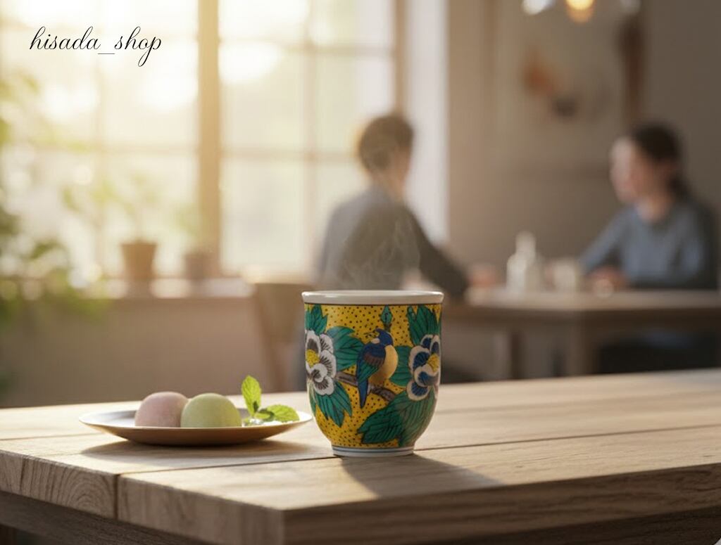 華やかで上品な和柄が魅力の 湯呑(湯のみ)。美しい 牡丹の花と鳥のモチーフ が繊細に描かれ、まるで絵画のような存在感を放ちます。職人による手仕事の仕上げが、日常のお茶時間をより特別なひとときにしてくれる逸品です。